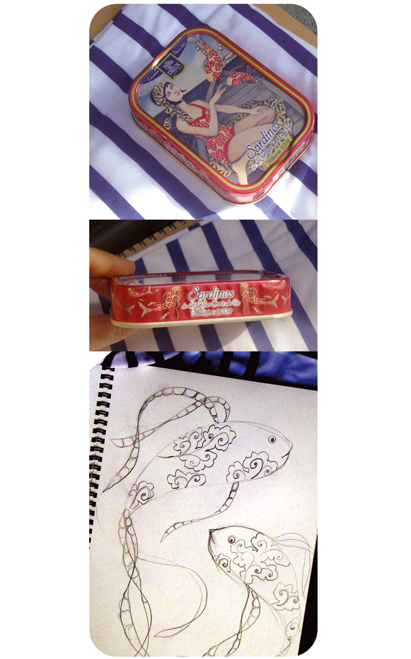 Les toiles pour les boites de sardines sont soumises à quelques contraintes, le format d'abord, homothétique à la petite boite et puis certains "vides" pour la marque et le texte...